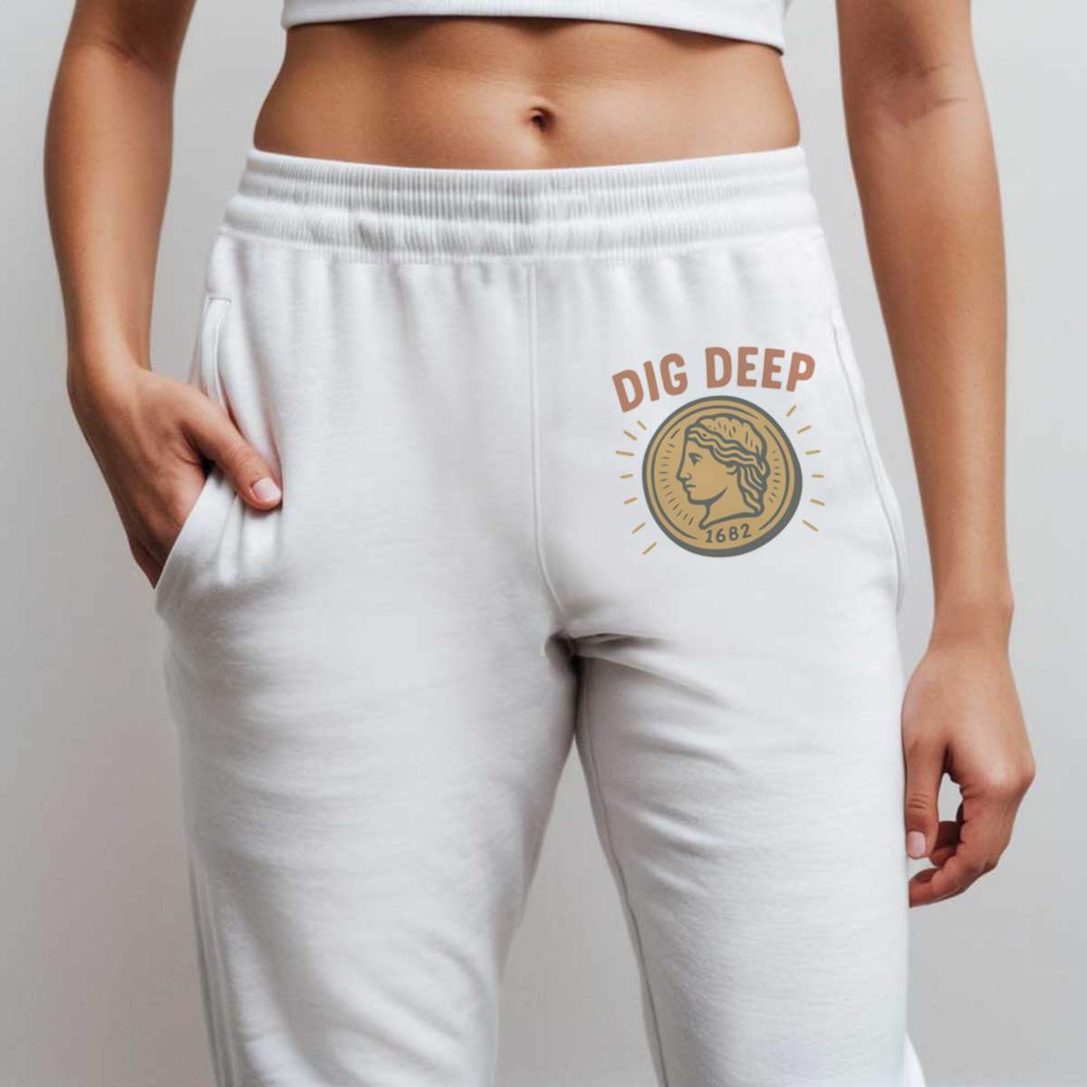'This graphic features a vintage-style coin with an effigy and the year '1682', surrounded by radiating lines, positioned beneath the bold text 'DIG DEEP'.'