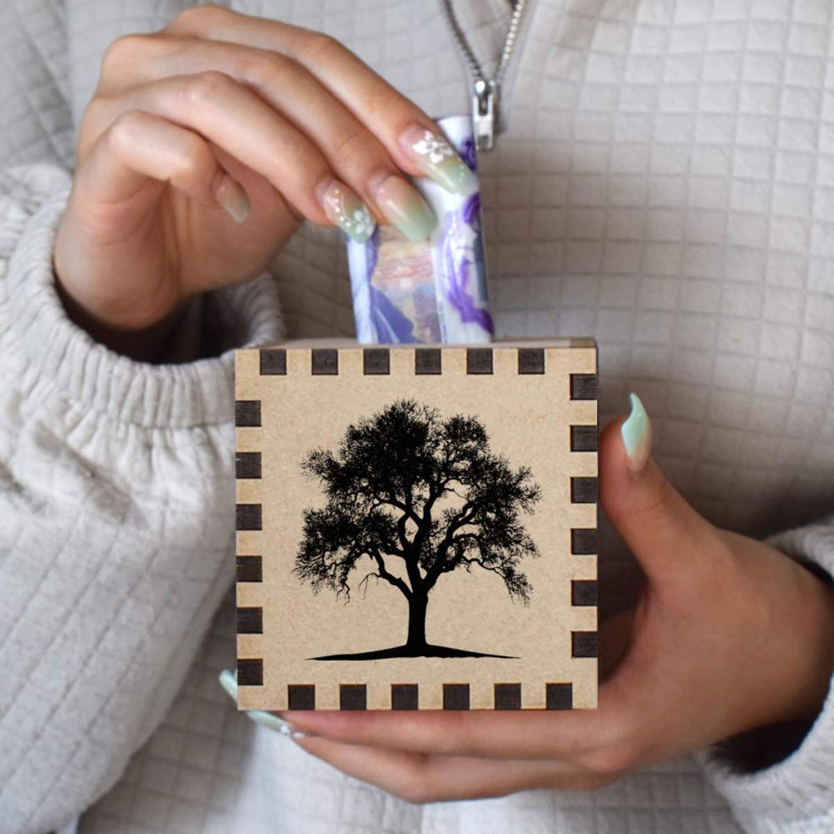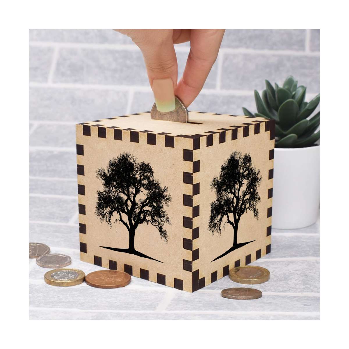 An 8.5cm wooden money box made out of the finest quality MDF and printed on all four sides with a unique design. The bottom is flat and the top has a slot for coins, the box itself is 85mm on each side, with a 35mm x 5mm coin slot, so please be sure it's suitable for you.
