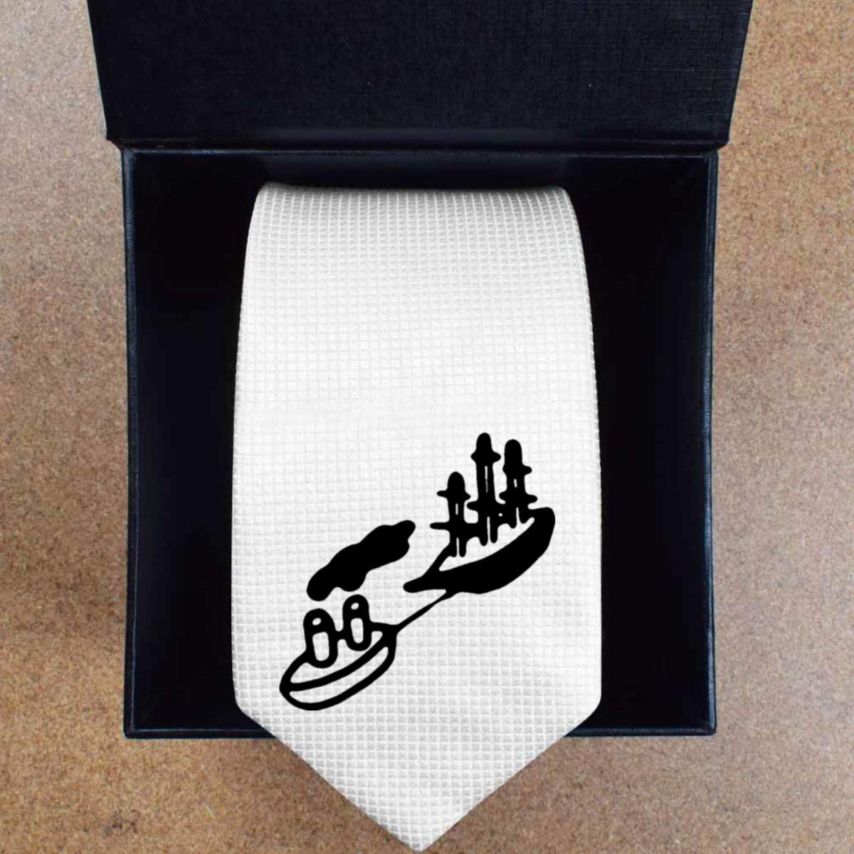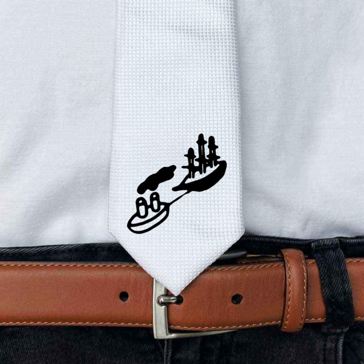 This stylish slim white tie is guaranteed to add class to any outfit. Printed on the front with a design from one of our talented designers, these ties are perfect for formal events, special occasions or making a statement at the office.