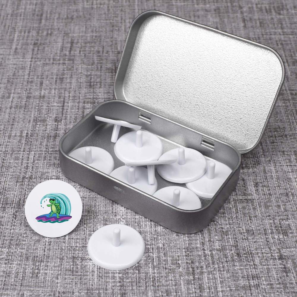 A fantastic gift for any golfer! This set includes 10 plastic golf markers, each printed on one side with a unique design. All 10 markers come in a small tin with a matching design printed on the lid.