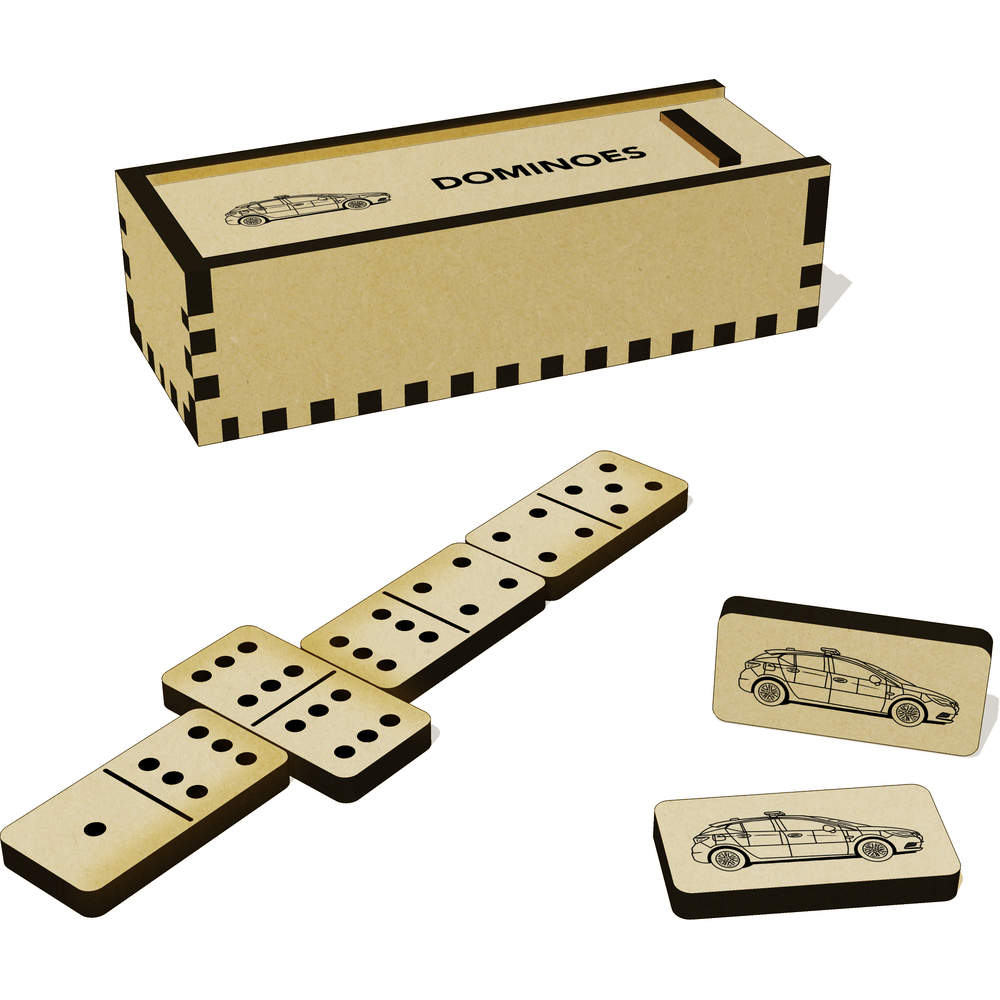 A full set of 28 MDF dominoes + an additional 6 blanks, complete with a slide top box to store them in.