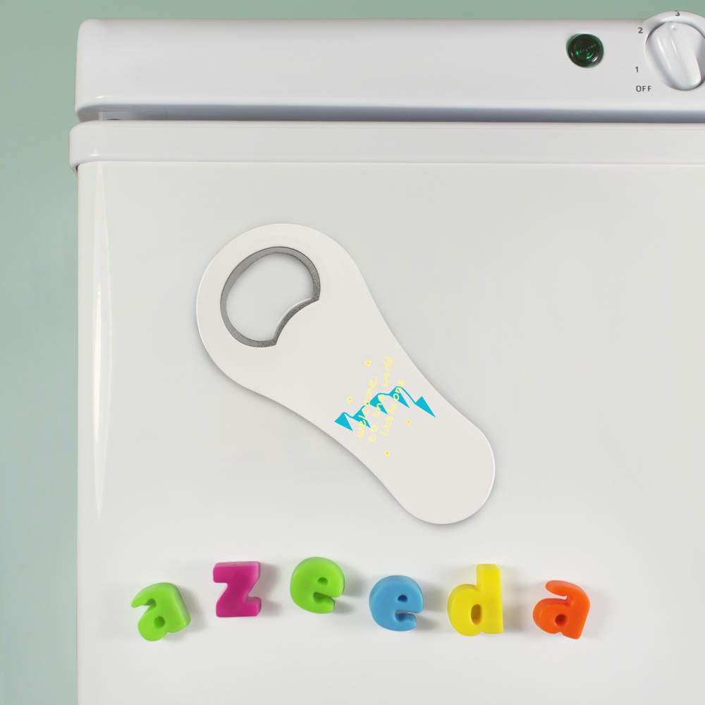 Pop the top where ever you are with this slim, lightweight bottle opener. Made from durable white plastic and printed on one side with a unique design. The back of the bottle opener has a small magnet, making it easy to stick to a fridge full of beer
