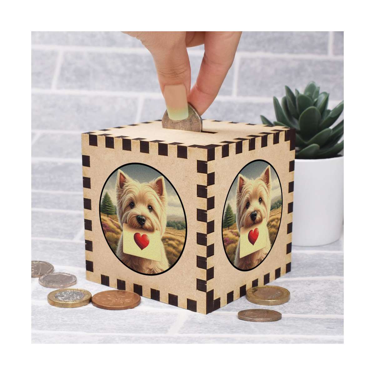 An 8.5cm wooden money box made out of the finest quality MDF and printed on all four sides with a unique design. The bottom is flat and the top has a slot for coins, the box itself is 85mm on each side, with a 35mm x 5mm coin slot, so please be sure it's suitable for you.