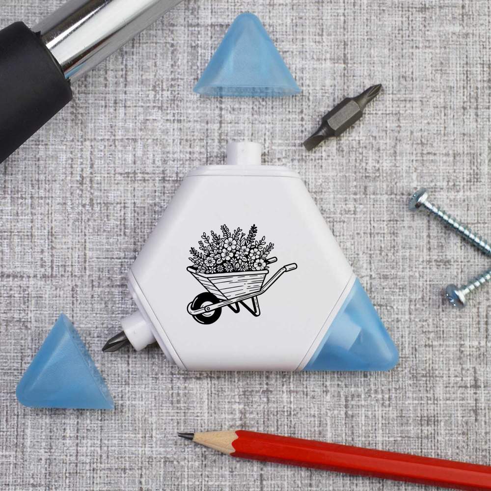 Our triangular compact multi tool is printed on one side with a unique design, making it a great gift for DIY lovers. This 3-in-1 tool set contains a tape measure and 2 different screwdriver attachments and each corner has a snap shut lid. One corner reveals a 1 meter tape measure, while the others hide two reversible screwdriver attachments, one larger and one smaller, both of which have a cross head on one end and a flat head on the other.
