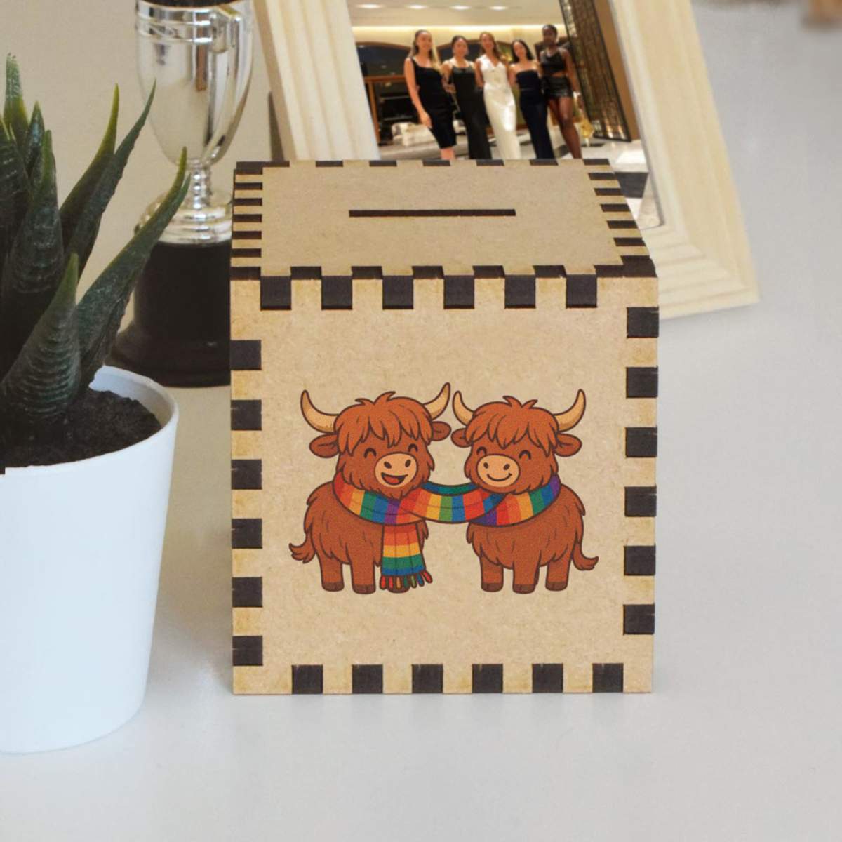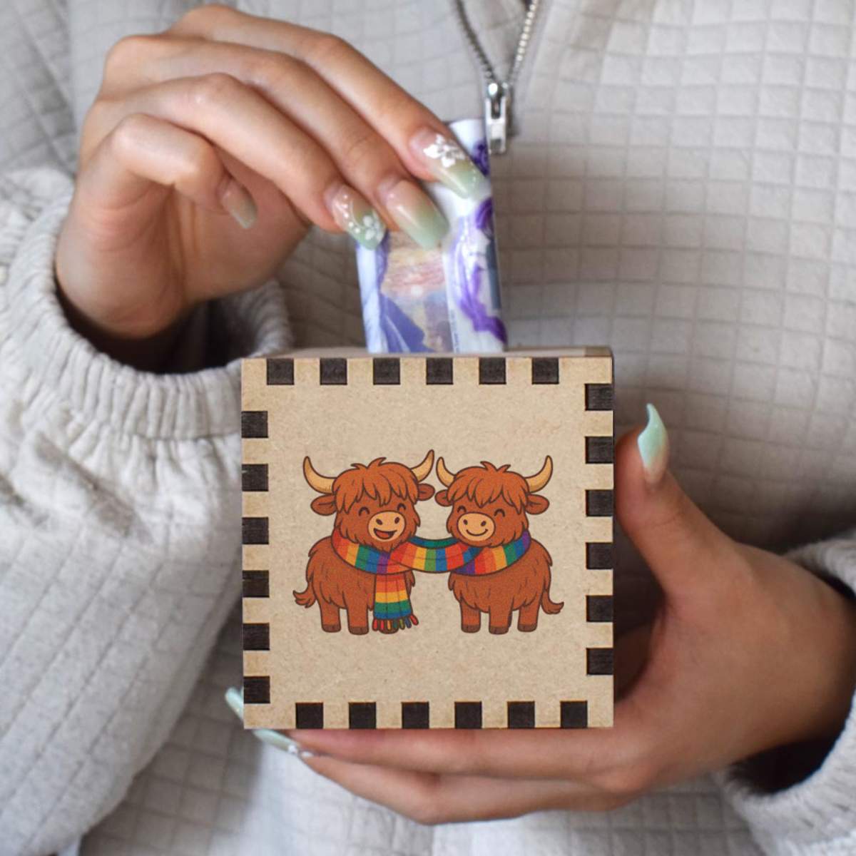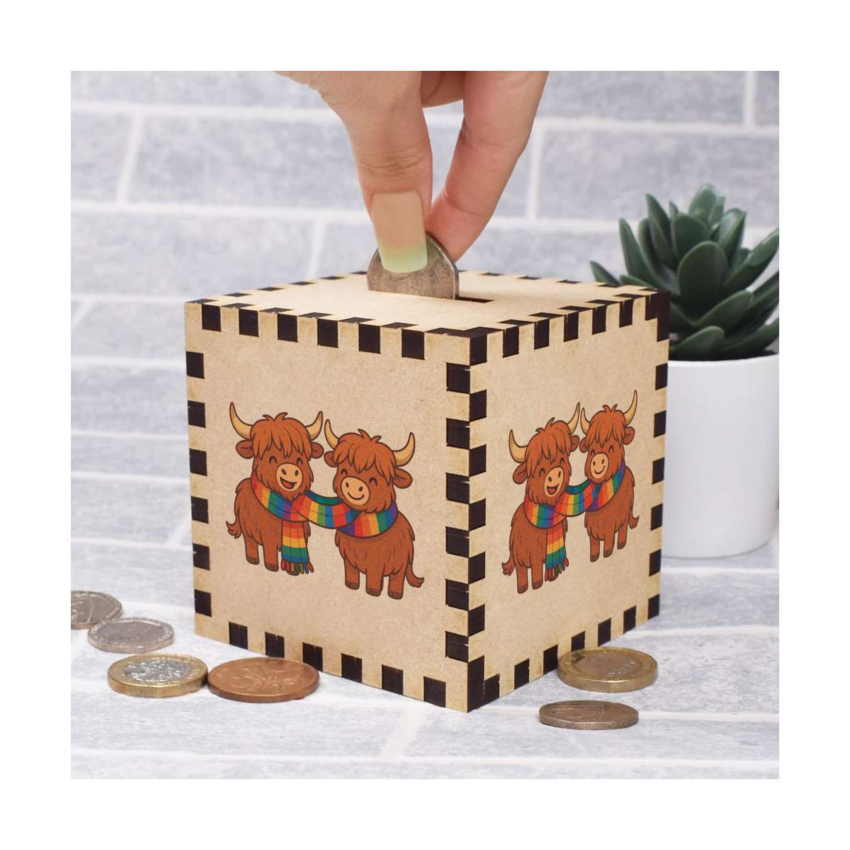 An 8.5cm wooden money box made out of the finest quality MDF and printed on all four sides with a unique design. The bottom is flat and the top has a slot for coins, the box itself is 85mm on each side, with a 35mm x 5mm coin slot, so please be sure it's suitable for you.