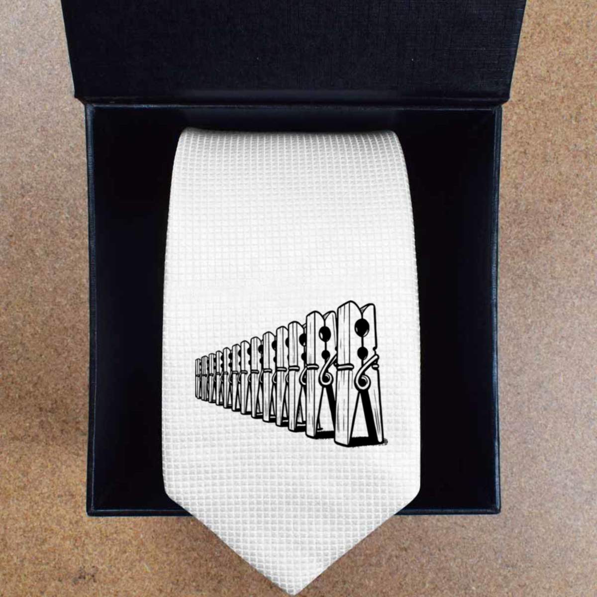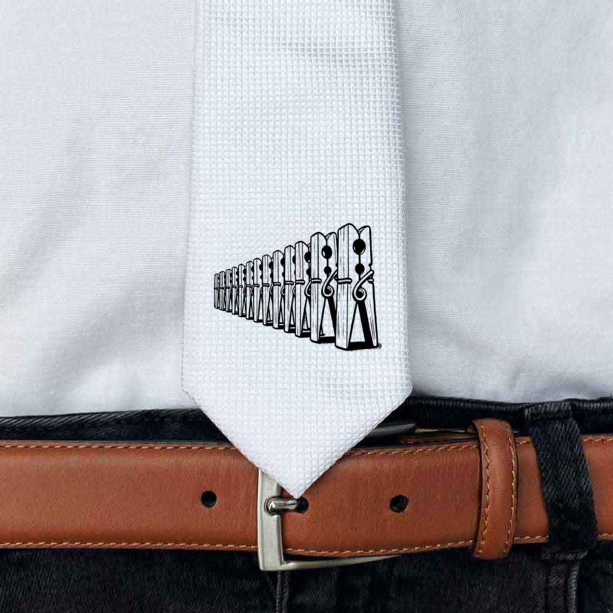 This stylish slim white tie is guaranteed to add class to any outfit. Printed on the front with a design from one of our talented designers, these ties are perfect for formal events, special occasions or making a statement at the office.