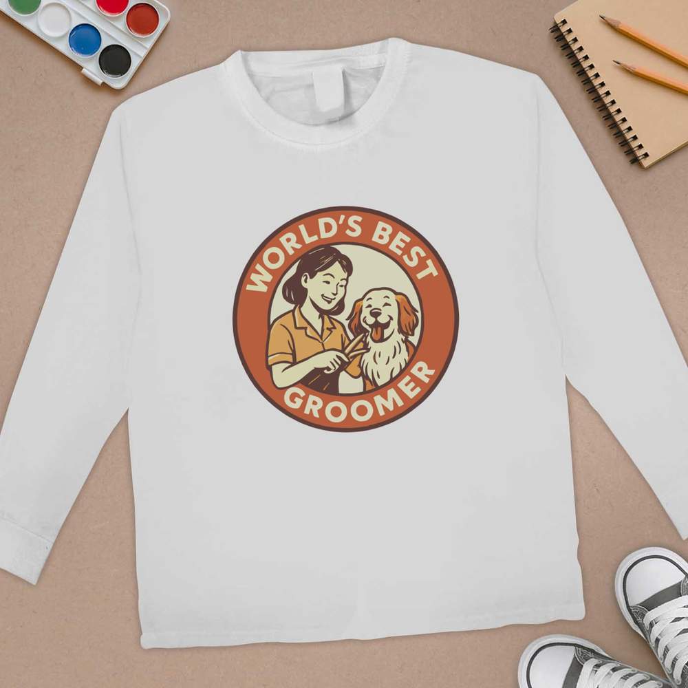 'A young woman grooming a dog with the words 'World's Best Groomer'.'