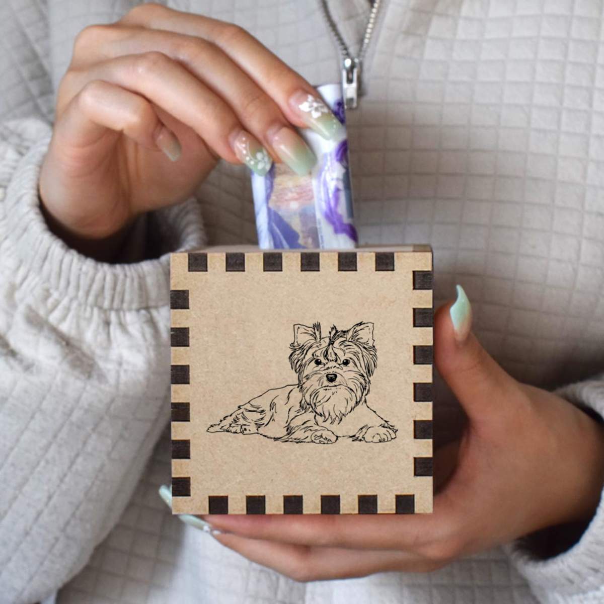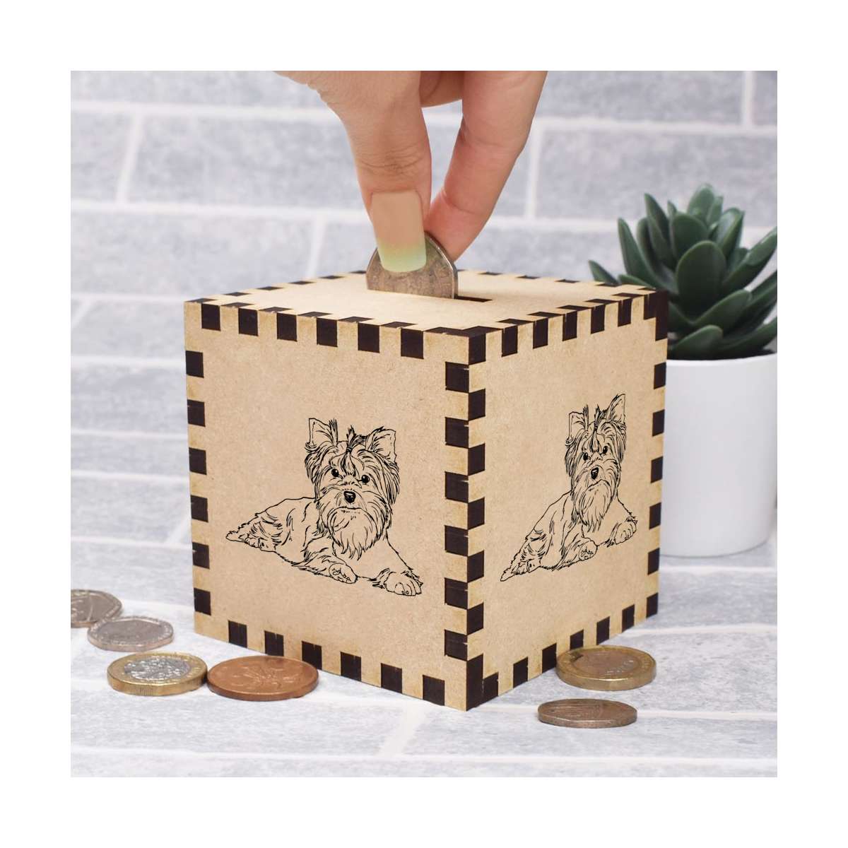An 8.5cm wooden money box made out of the finest quality MDF and printed on all four sides with a unique design. The bottom is flat and the top has a slot for coins, the box itself is 85mm on each side, with a 35mm x 5mm coin slot, so please be sure it's suitable for you.