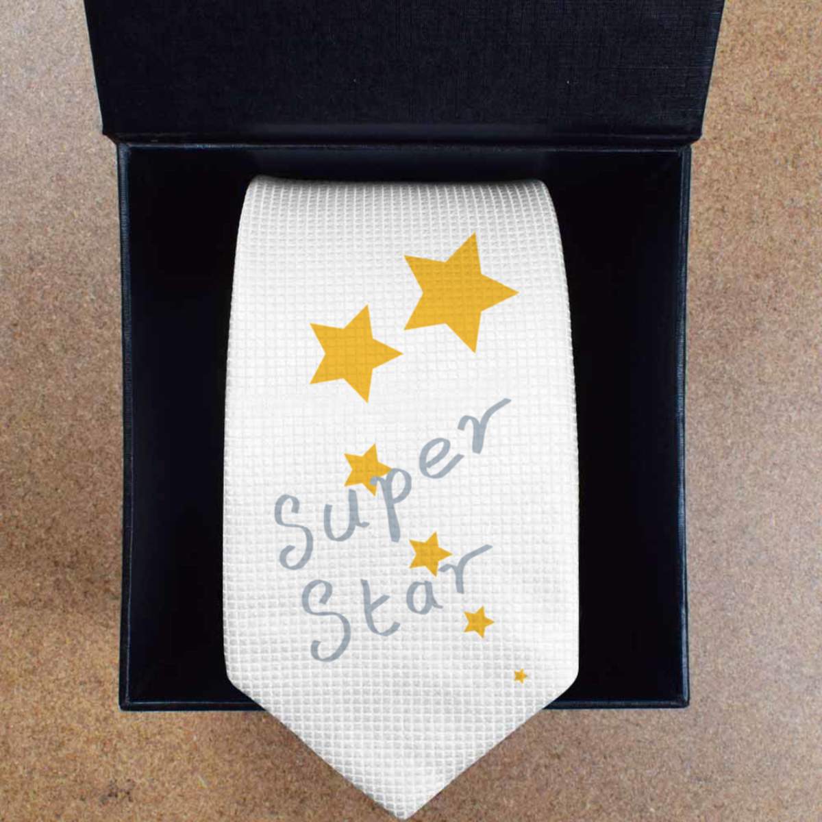 This stylish slim white tie is guaranteed to add class to any outfit. Printed on the front with a design from one of our talented designers, these ties are perfect for formal events, special occasions or making a statement at the office.