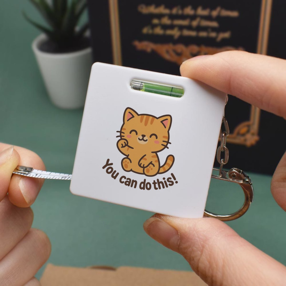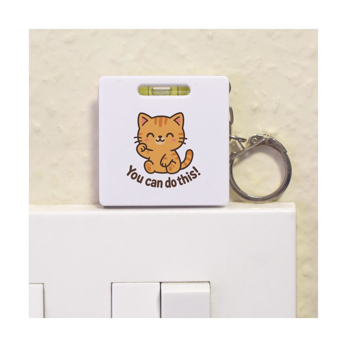 This multifunctional tool offers both a tape measure and spirit level in one handy little accessory. The retractable, 1 metre tape measure has both imperial and metric units, while the flat edges around its plastic casing provide the ability to check both vertical and horizontal surfaces with a mini spirit level. The compact and lightweight design makes it easy to carry around; simply attach with the keychain provided and whip it out when needed. Each keyring tape measure tool is printed on one side with a unique design.